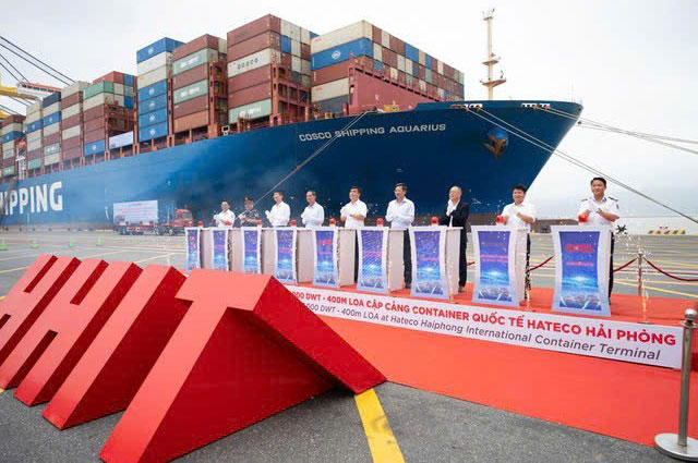 Các đại biểu dự lễ đón siêu tàu Cosco Shipping Aquarius cập Cảng container quốc tế Hateco Hải Phòng.