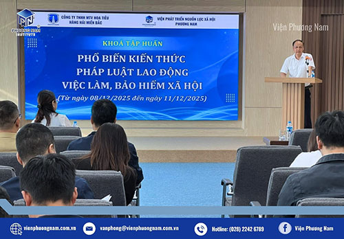 Ngày 08/12/2025, Viện phát triển nguồn lực xã hội Phương Nam (Viện Phương Nam) đã phối hợp với Công ty Hoa tiêu hàng hải miền Bắc tổ chức khoá tập huấn “Phổ biến kiến thức Pháp luật Lao động - Việc làm, Bảo hiểm xã hội”.